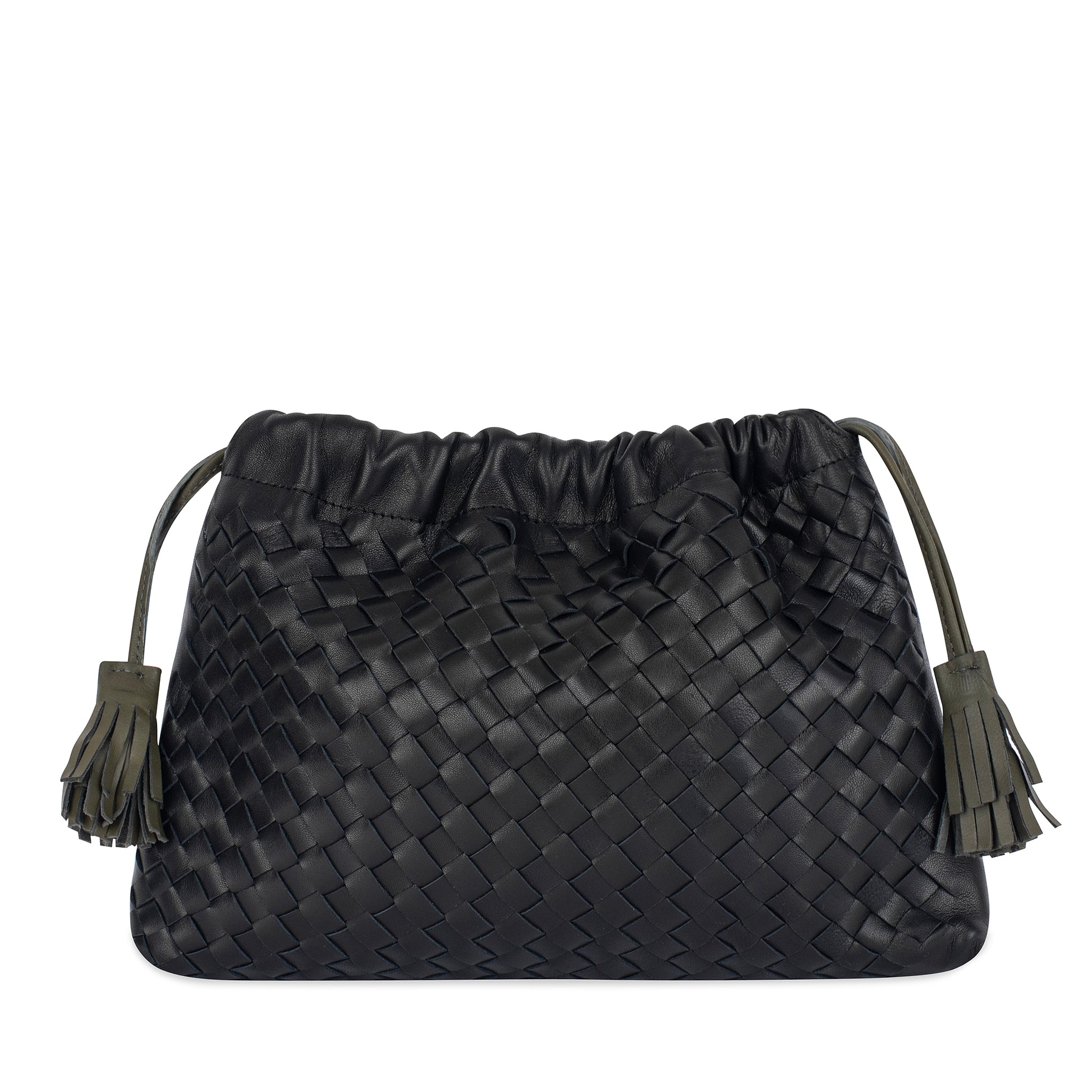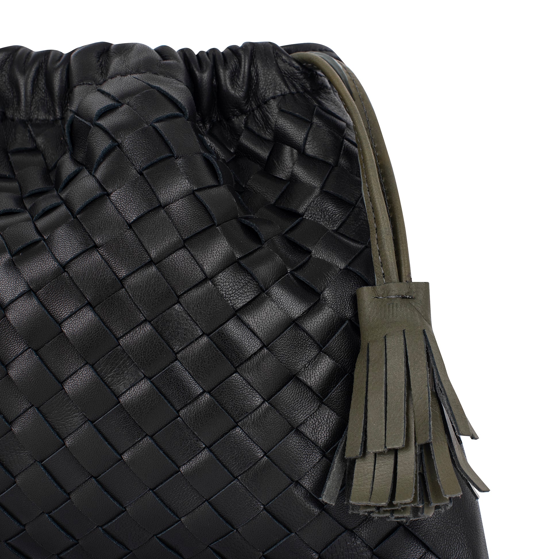 This design as dust bag in braid leather with drawstring and magnet closure and a loop in gold for a attachment tu use shourder carry