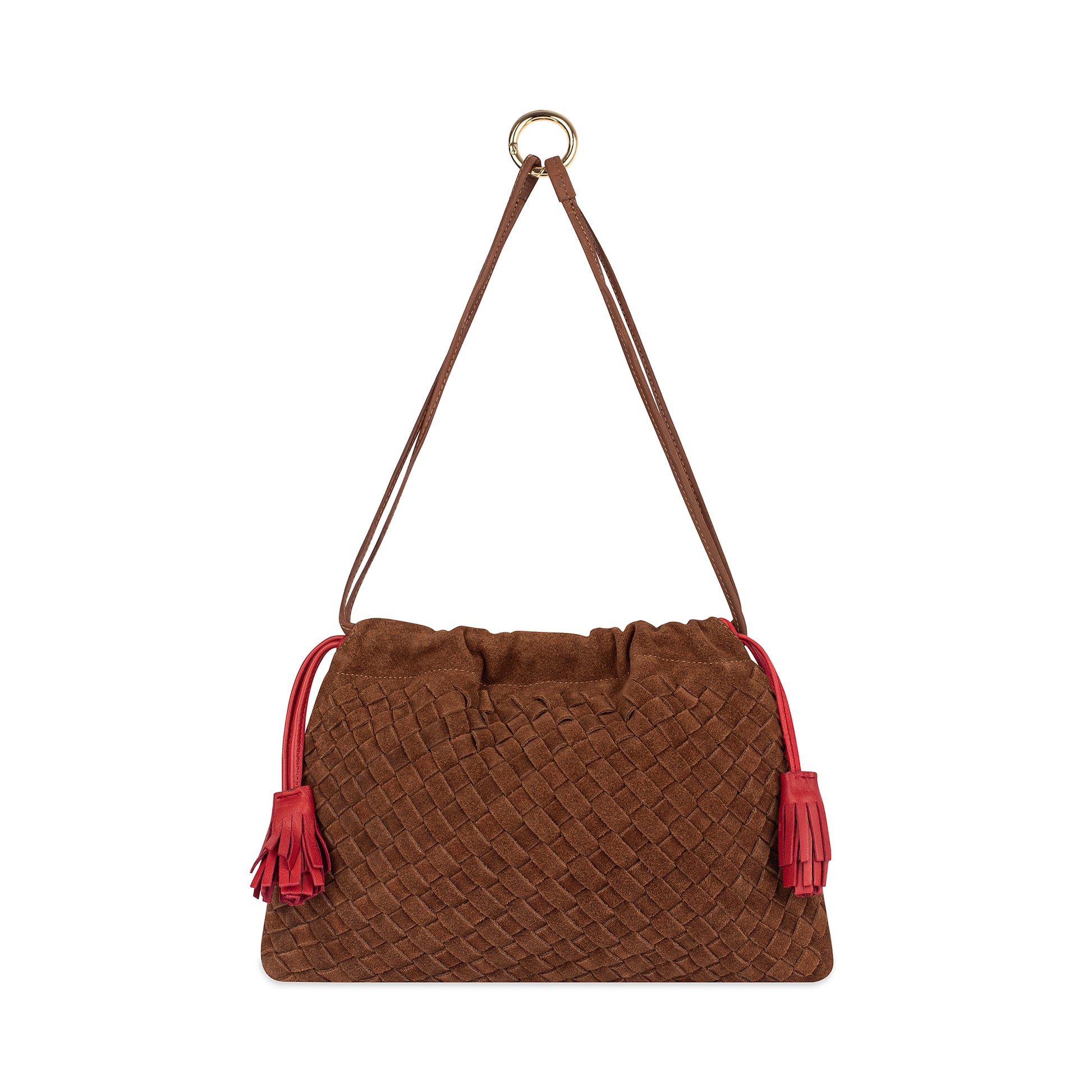 This design as dust bag in braid leather with drawstring and magnet closure and a loop in gold for a attachment tu use shourder carry