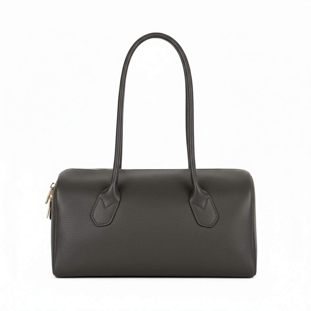 Bag made of graines leather smooth finish. Zipper closure. Two handles for hand and shoulder carry. One interior compartment. Interior lining in suede texture